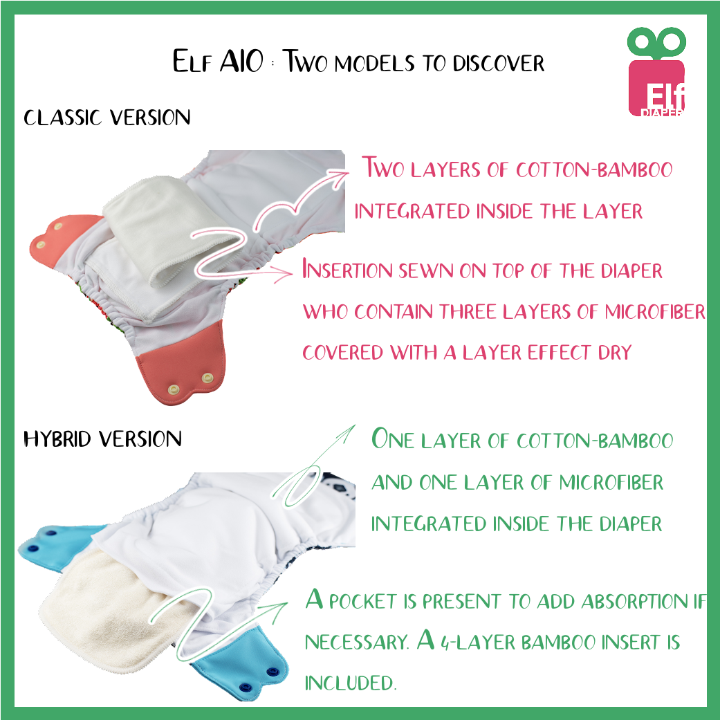 The hybrid formula All-in-One diaper, on the other hand, gives you the advantage of the all-in-one diaper combined with the versatility of the pocket diaper. There you will find an absorbent insert integrated into the diaper as well as a pocket with a bamboo insert to use as needed.